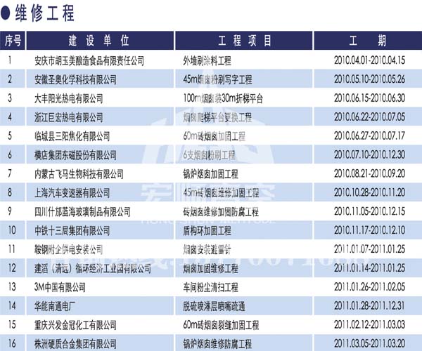 宏順建設(shè)工程有限公司是國家批準(zhǔn)成立的專業(yè)高空作業(yè)企業(yè):承攬過(國內(nèi).國外)煙囪新建、煙囪防腐、磚煙囪新建、煙囪改造、煙囪維修、煙囪脫硫防腐、煙囪拆除加高、煙囪滑膜等高空作業(yè)工程。具有“不搭腳手架 、 不需要停產(chǎn)”施工特點。